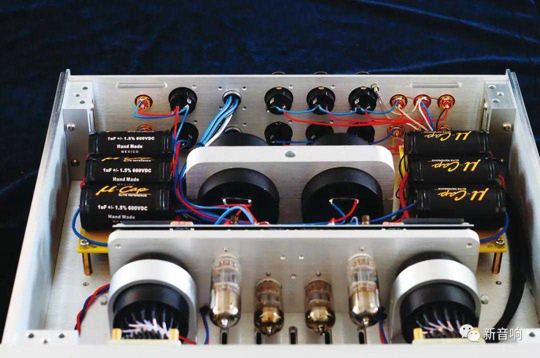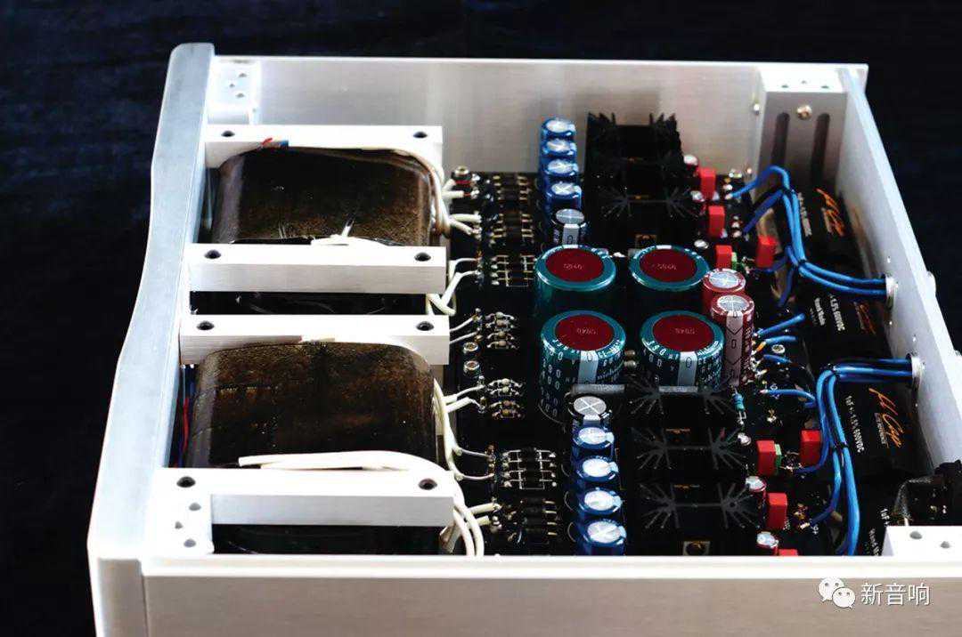 主机箱内所有功率晶体管靠左右二侧散热片锁固,中间有个巨大的双层铝合金盒,里面是屏蔽的输出变压器,上面的增益、控制线路板隔着防震阻尼材料以三文治式阻尼方式安装,目的是消除即使最微小的机械共振,以免产生任何麦克风效应污染音乐讯号输出。机内接线部分采用定制的矩形纯银线,这是方光豪很引以为傲的材料,也说明了他从材料源头就自己掌控的决心。