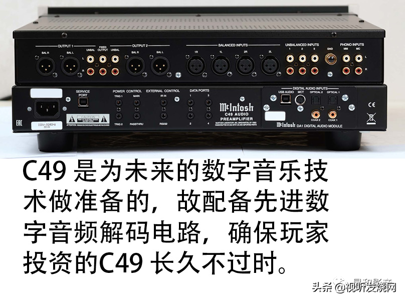 McIntosh近期推出了新型号C49前级放大器,是C47的升级替换型号,因为两者的面板和外观布局与机箱制造级别保持相同的水准。而最大的升级改变其实要从背板上才能看到,那就是C47的固定式数字输入端子被C49的数字模组替代了。这个模组型号为DA1,是McIntosh适应最新音乐技术时代的理念下的产物,令麦景图的产品时刻保持技术领先。