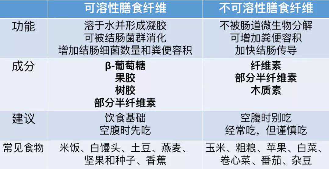 可溶性膳食纤维溶于水并形成凝胶,可被结肠菌群消化,增加结肠细菌数量和粪便容积;不可溶性膳食纤维不被肠道微生物分解,可增加粪便容积,加快结肠传输。