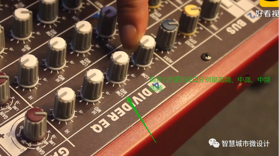 能对高频、中高频、中频、低频四段频率电信号分别进行调节,当然为了方便大家使用,调音台也是简单粗暴地设置了集中模式如: