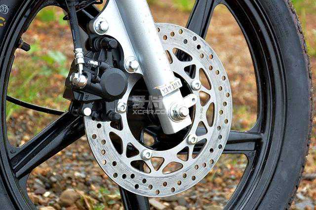 YBR150Z分为碟刹版和鼓刹版,此次试驾的车辆为碟刹版,前刹车系统为单向单活塞卡钳搭配单通风盘。
