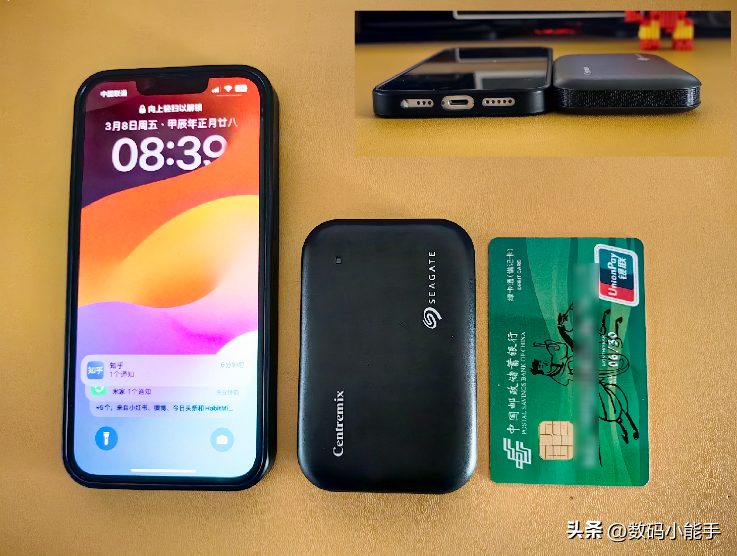 它的三维分别为94x60x15mm,如果你没有概念可以通过上图的比较,它的大小就和一张标准的以银行卡差不多,并且厚度比我戴保护壳的iPhone相近,可以说是相当的便携了!