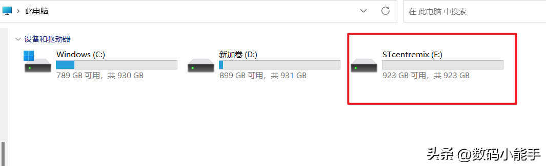 连接电脑之后可以看到电脑会自动识别硬盘,并且还会准确显示盘符和图标,显示的可用容量为923GB,因为硬盘厂家和电脑系统两者的进制算法不一样,1T的硬盘这里显示923GB是完全正常,没有虚标。