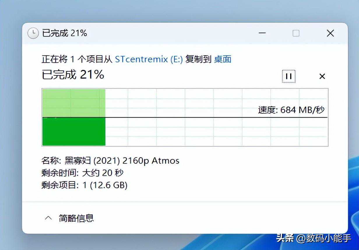 软件测试了,看一看实际的拷贝速度。我国通拖动一个较大的影视文件看看它的表现。可以看出写入速度达到640MB/s,读取速度达到680MB/s,并且在传输过程中,速度波动几乎就是一条直线,说明传输还是很稳定的。