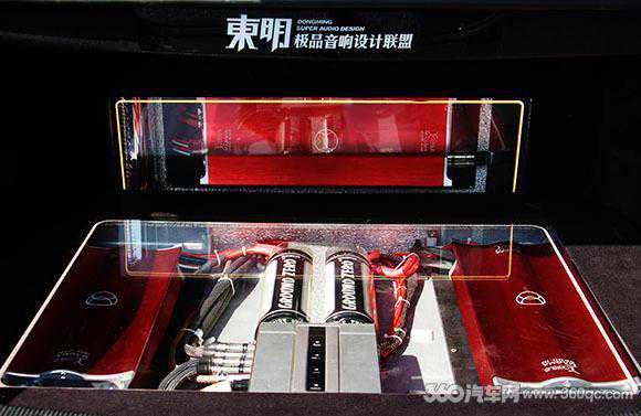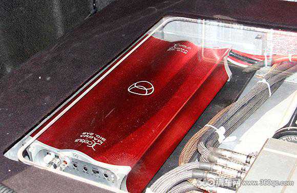 超低音系统设计特别,也是改装团队标志性的前装副驾驶手扶箱典型风格。超低音喇叭选用卓美银钻系列XXS10十寸,由一台卓美红钻单声道功放推动。低音前置方式和前声场中低音有更好衔接,同样卓美银钻系列则更为自然顺滑,低音力度和准确性俱佳。此外低音前置后尾箱则有更大空间利用,放置三台后级功放和解码器,加入法拉电容提升大动态稳定,再以透明装饰板盖上保护,整体美观又不影响尾箱实用性。