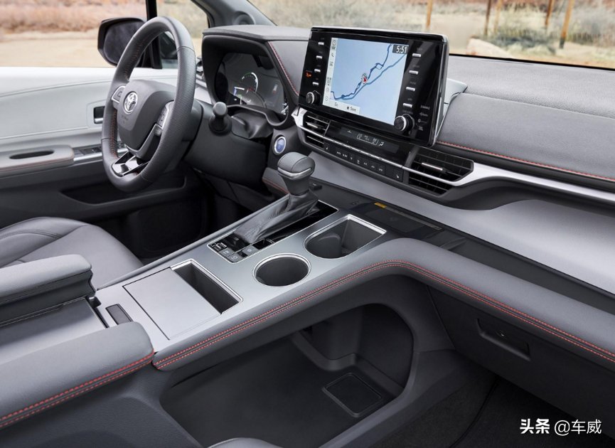 相比于外观的运动,全新一代塞纳的内饰设计明显以居家风格为主,中控台富有层次感,9英寸中控屏支持AndroidAuto/CarPlay功能,T型档杆区下方采用贯通式的通道设计,储物空间相当可观。在用料方面,豪华版选择了大面积木纹面板以及皮质包裹,为其注入了许多豪华感,运动版车型则采用的拉丝面板和红色缝线搭配来提升动感。