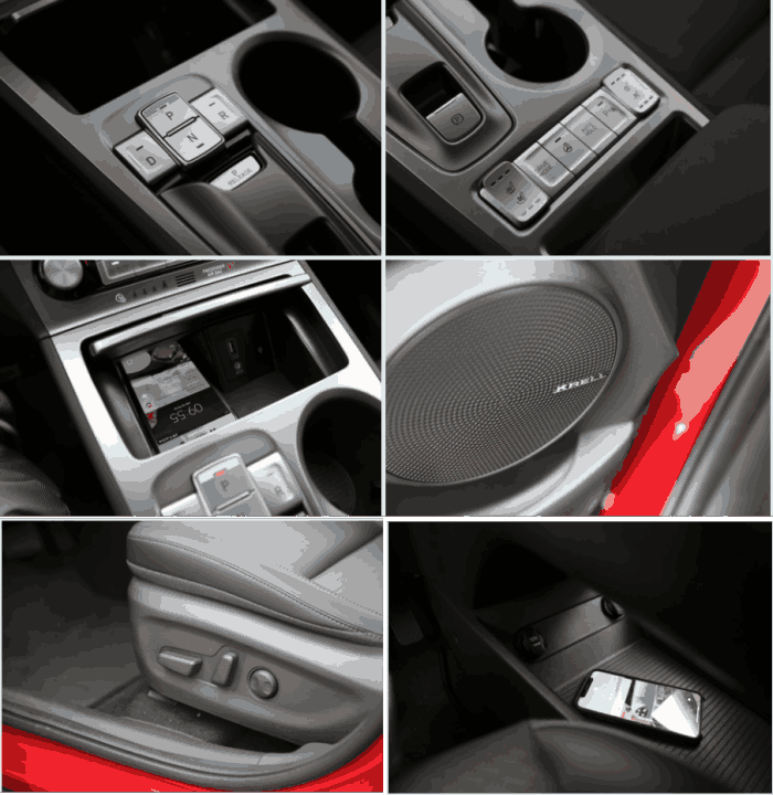 KonaElectric最大的特点是中控台,由于没有了挡把,中控台就可以布置更多功能。传统的变速箱挡把被变速按钮所取代。杯架的前面是智能手机的无线充电装置。座椅通风和加热在小型SUV上并不多见。KRELL音响系统,车道保持这些豪华配置也是昂希诺上没有的。