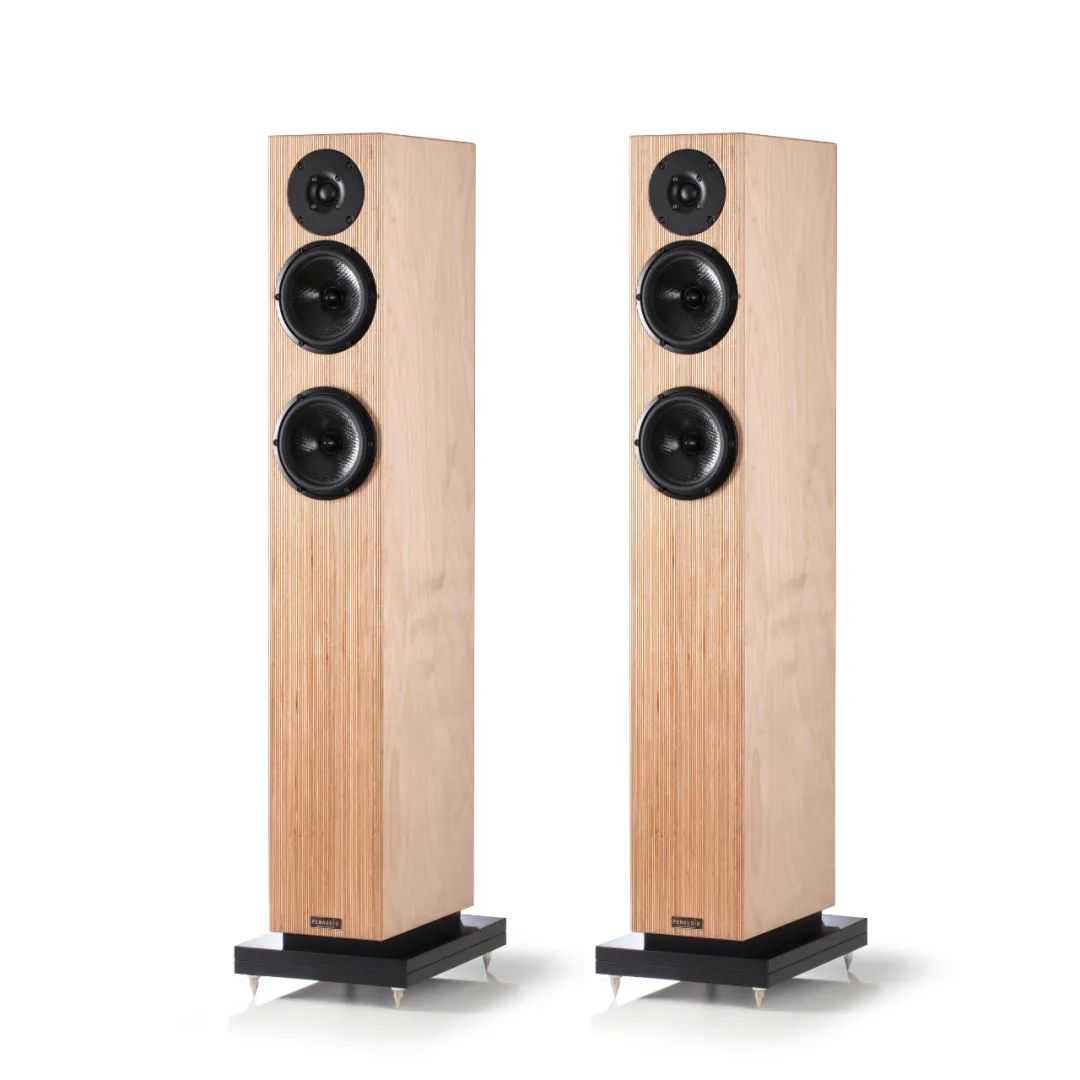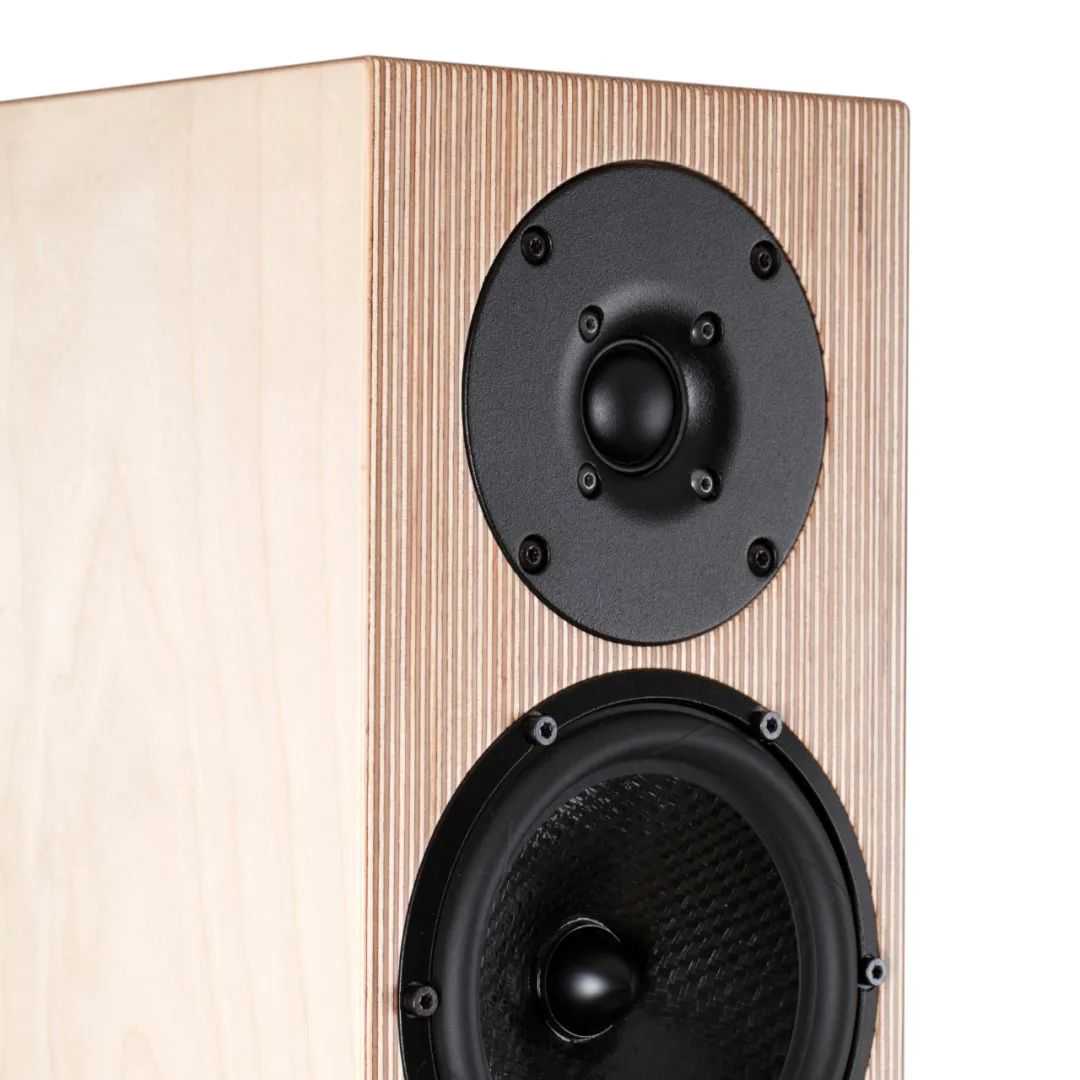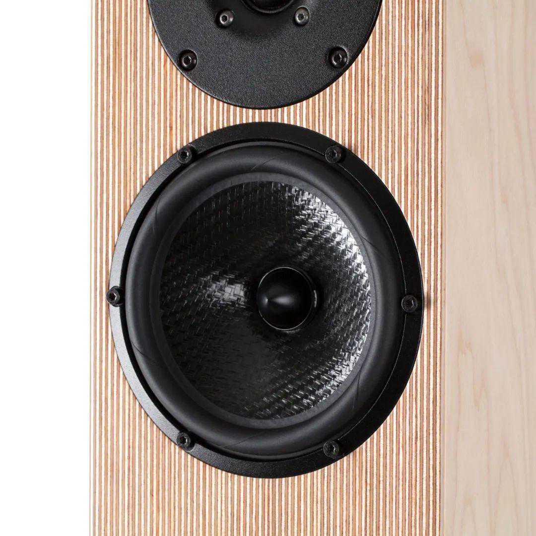对于PENAUDIOTalvi音箱来说手段是使用了PENAUDIO的标志性箱体结构。这种结构称为“多层结构板”,为PENAUDIO所独创,具有很高的辨识度。近看这些条纹您会发现这其实是由两种不同的薄木片交错堆叠层压而成的。单一的箱体材料处理谐振通常不太理想,因为每种材料都有固定的谐振频率。PENAUDIO是通过多种材料的相互作用,来将箱体谐振抵消,而实际效果证明这种做法非常有效。做法是将很薄的桦木夹板和中密度板交错地一片一片粘起来,然后再经过加压高温黏合。制作音箱时,将“多层结构板”的侧面一片一片地切开,应用于箱体的每个平面。