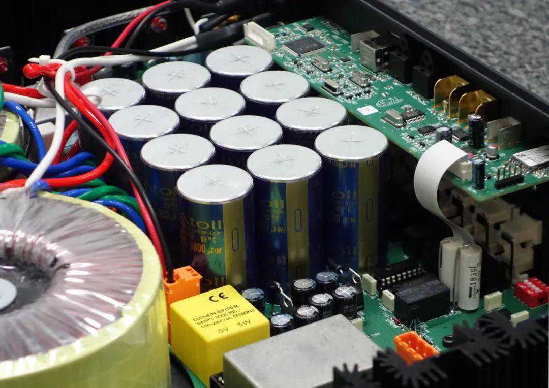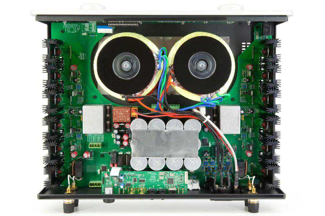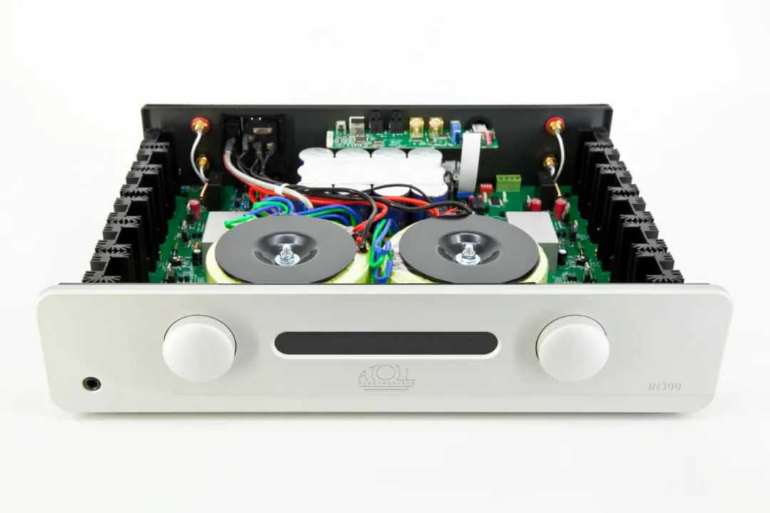 从结构上看,IN300为完全对称的双单声道结构,打开机盖可见由“日本化工”给ATOLL定制的滤波电容“森林”,由12只6800微法电容组成。IN300使用全分立元件,摒弃前级使用集成块的做法。两只各440VA的环形变压器负责给模拟部分供电,另外有1只5VA小变压器给数字部分供电。机内随处可见来自Mundorf和Vishay的补品级MKP电容,用料相当发烧。
