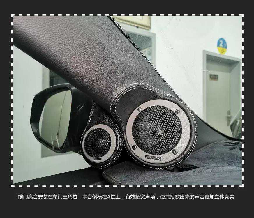 前声扬升级了丹拿ESOTAN372三分频套装喇叭,它的中低音原位无损安装,不会破坏原有的线路,而高音安装在车门三角位上,中音则倒模在A柱,这样的安装方式不仅让高频与中频有较好的衔接,也可以拓宽声扬,让喇叭播放出来的声音更加立体真实。
