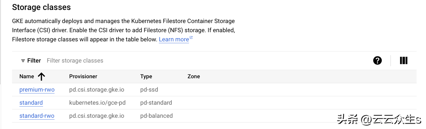 我们查看Kubernetes提供程序中可用的存储类。在这种情况下,我们正在部署在GKE上。我们看到我们有3个可用的存储类: