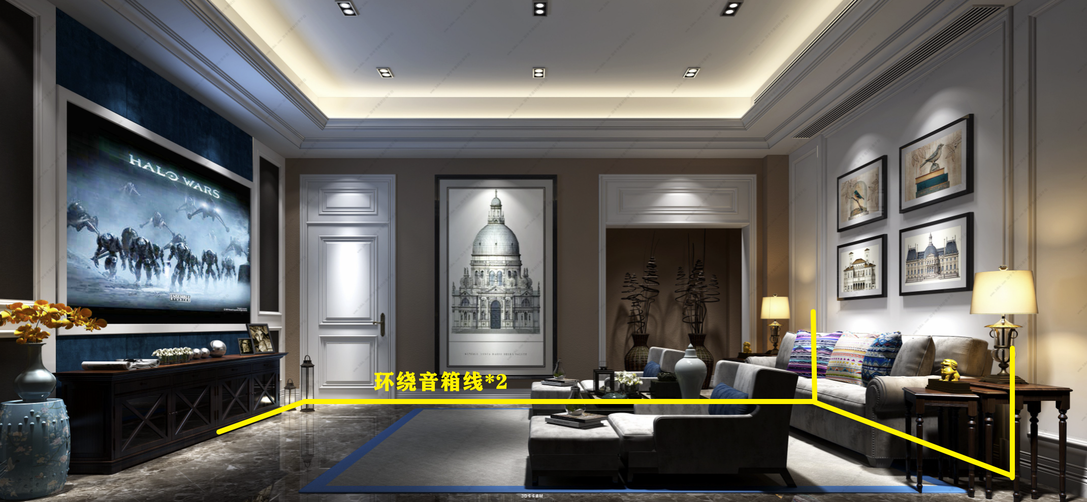 ▼如果想要5.1.2声道,还要增加两条音箱线到正面吊顶上方的位置。