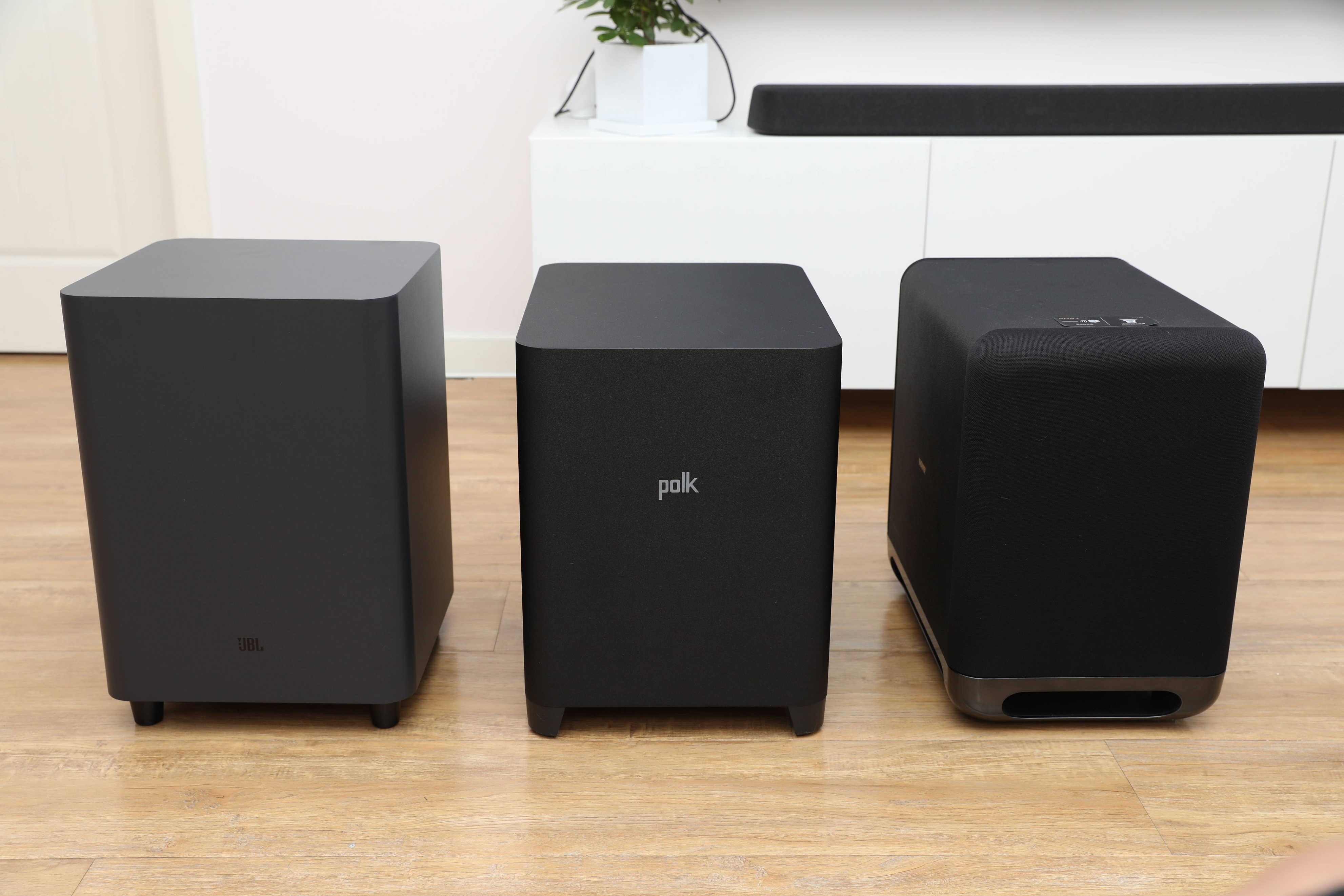 另一个大件就是这个低音炮了,其中Polk的体积最小,且logo标识明显,纯黑的设计显得很庄重;JBL的颜值是我本人喜欢的,深空灰的色调很有科技感,整机看起来一体感很高,很像一个电脑主机。