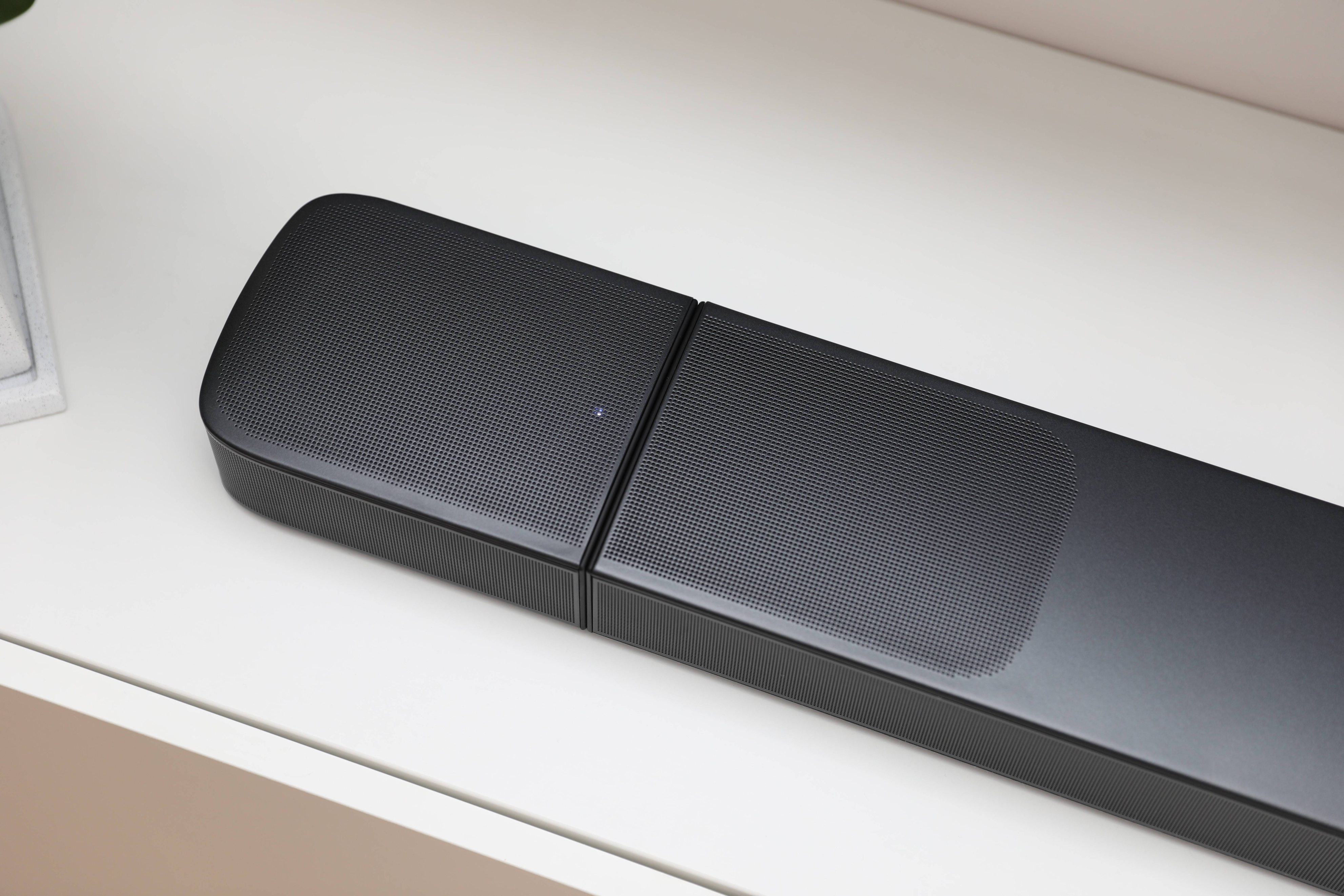 回音壁的材质搭配上,三家也各不一样,索尼采用了大面积的金属网罩和玻璃面板,不同材质之间的衔接过渡也很自然;Polk则采用了多面大面积的布艺包裹,整体性更强;JBL采用了仿金属的设计,磨砂手感摸起来也很舒服,并且践行了对称式的设计语言。