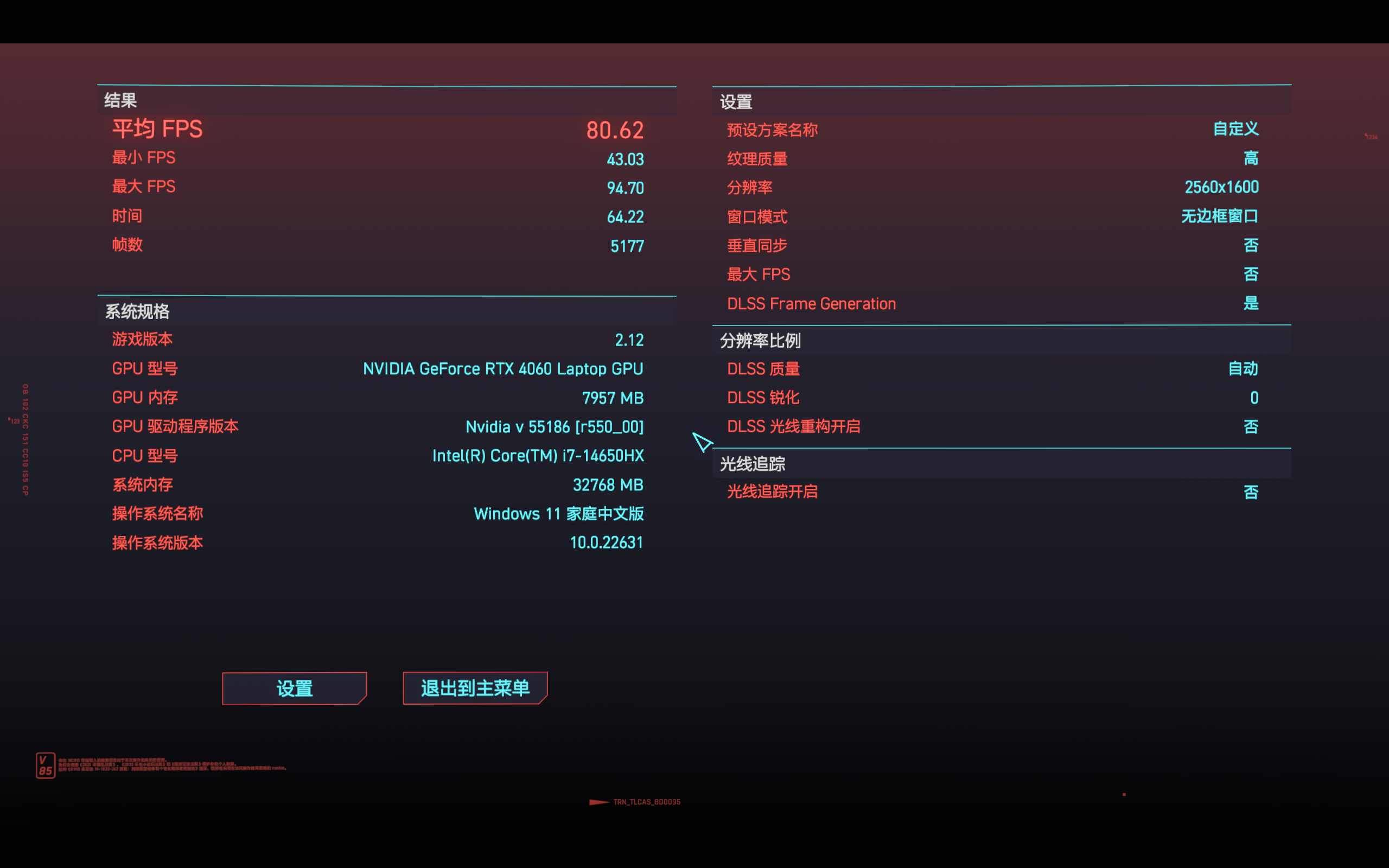 作为今年中端游戏本的主流配置,i7-14650HX+RTX4060的组合能够很好地应对各种热门3A游戏。只要稍微降低一些画质,即便是《赛博朋克2077》《狂野之心》也可以实现帧流畅游玩,在开启DLSS的情况下甚至可以流畅体验光追特效,可以满足游戏玩家的各种需求。