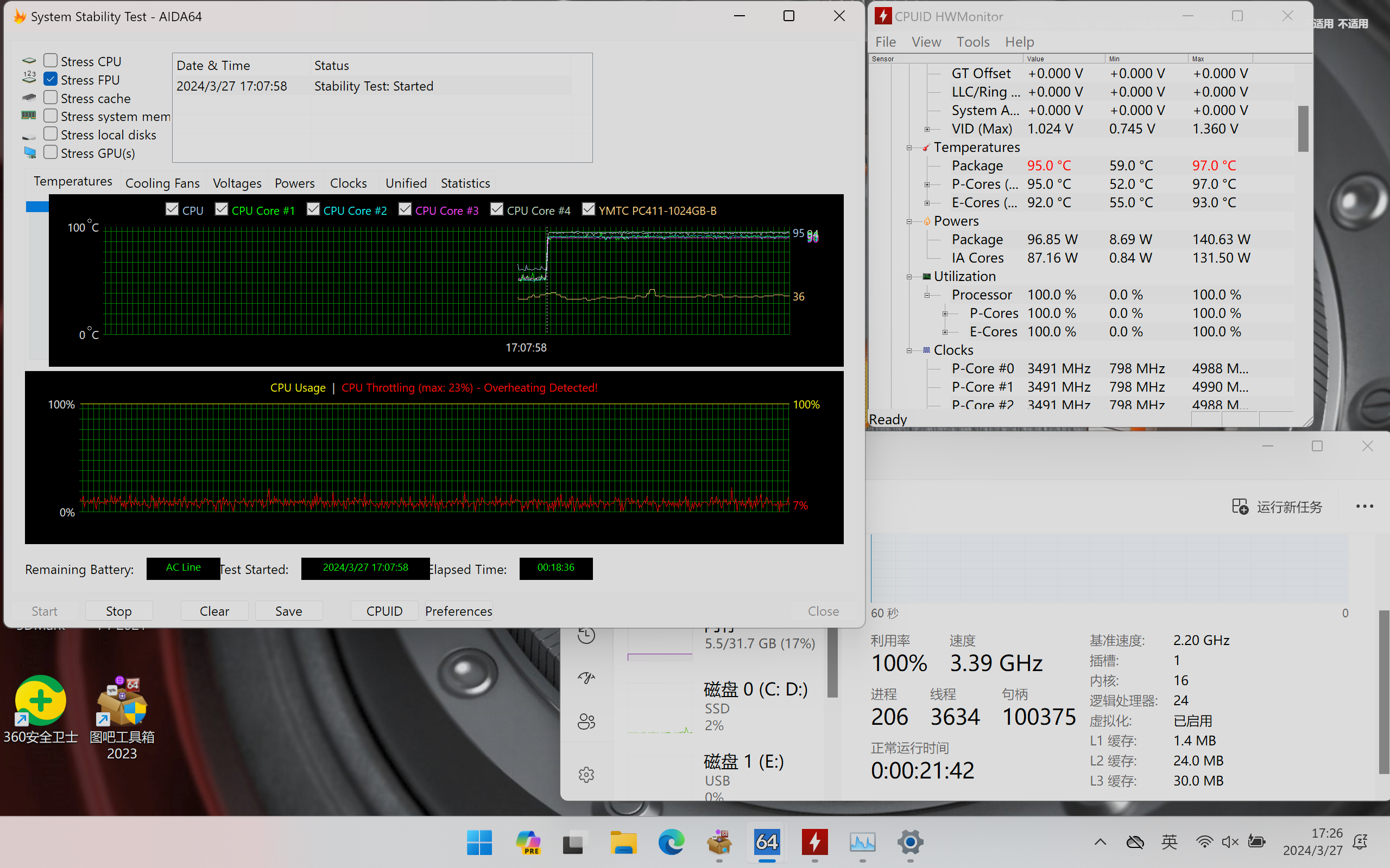 在单烤CPU的情况下,20分钟测试后,机械革命耀世15Pro的这颗CPU依然能够运行在3.4GHz,CPU的功耗可以维持在97W。