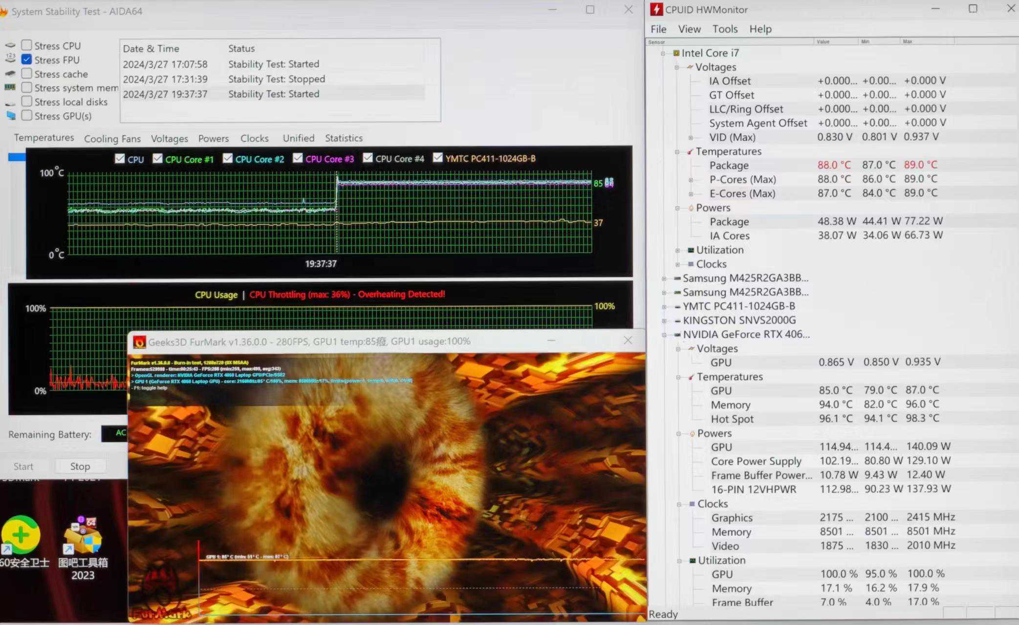 在单烤GPU的情况下,20分钟测试后,机械革命耀世15Pro的这颗GPU依然能够运行在2325MHz,GPU的功耗可以维持在140W,与此同时人位噪音也不算明显。