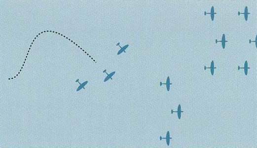 1938年英国皇家空军正式公布的《空中战术手册》中制定六种标准中队战斗区域攻击模式,英国皇家空军标准战斗机编队是三架飞机组成的V形编队,一个由12架飞机组成的中队分为A和B两个飞行段,这些飞行段依次由三架战斗机组成。当处于全速战斗编队时,所有12架飞机将被紧密地分成四个部分,每组3架战斗机。领头长机负责搜寻敌机,其他飞行员严格保持编队位置,彼此掩护,但视野受限。这种死板的队形飞行表演或者演习很漂亮,上战场就悲剧了。