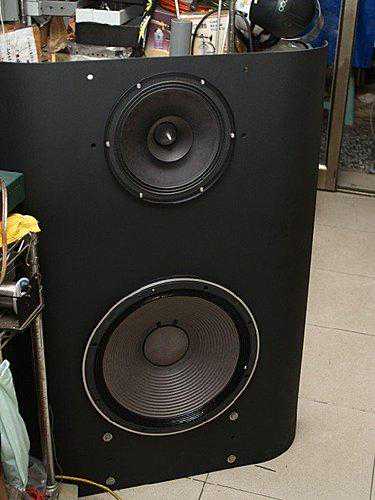 接着这位用家又听到我这里的原型号角,问我"Colin这是什么?"大略解释过后再问我"那我家有一对长的像是黑馒头的(ALTEC288c)可不可以装?"当然可以啦,于是我设计了一个可以放在帐版上的支架,放置的弧度以288直径以及原木号角的直径为准,做了一个U型铁架,高度抓的比SP-250稍高,不会挡住SP-250的发声,重达20公斤的号角加驱动器放上去后,相当稳固,原先还有一个JBL2405超高音在一旁,但是拍照时,还没放上去。