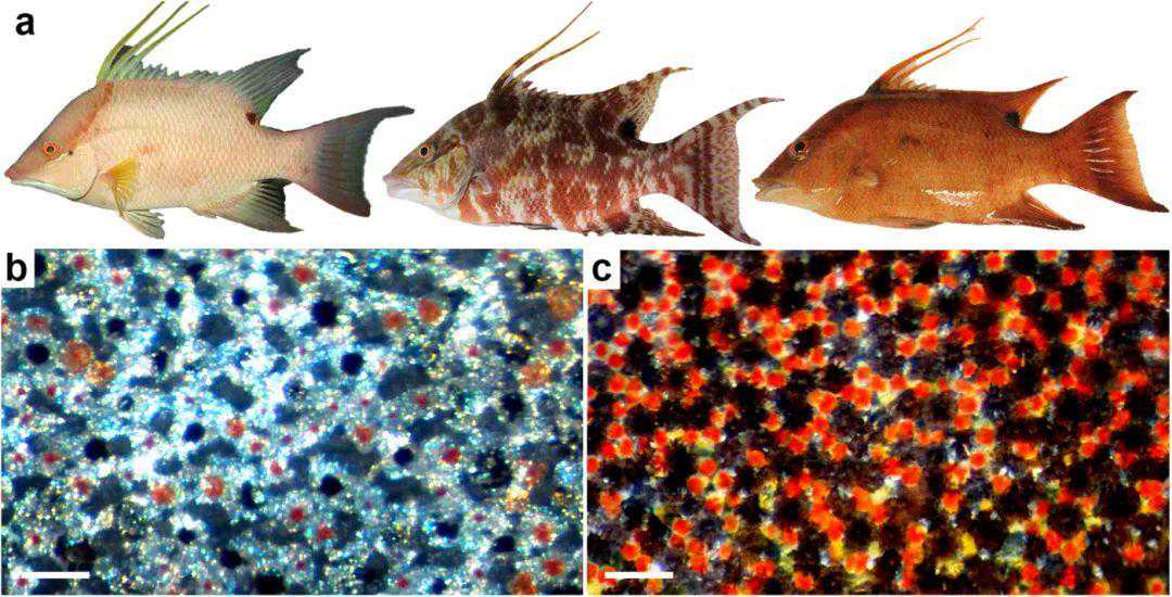 变色过程就是色素颗粒的运动过程虽然死鱼变色的问题貌似解决了,但更多的只是基于基因组学的分析,并没有从细胞学的角度做实验分析。2023年8月22日,施韦克特的研究团队在《自然通讯》上发表了关于猪形鱼变色的进一步研究,这次不再是从基因组学进行分析,而是对皮肤细胞进行观察实验。科学家从猪形鱼的不同部位取下皮肤样本,然后放到显微镜下观察。下图中,左边是变成白色的皮肤样本,右边是变成红棕色的皮肤样本。