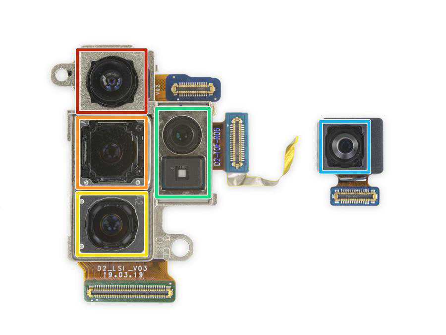 镜头阵列,Note10+5G版一共有5枚镜头,4枚后置。红框:1600万像素广角镜头(123°);橙框:1200万像素广角镜头,带有F/1.5和F/2.4双光圈切换;黄框:1200万像素长焦镜头;绿框:深度信息镜头和传感器;蓝框:前置1000万像素镜头。