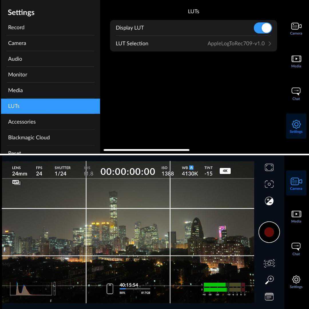 另外使用BlackmagicCam还有一个好处,就是app允许导入还原Lut在拍摄时进行色彩还原监看。这就避免了因为拍摄灰片而导致的曝光无法准确判断的问题,让我们可以非常准确方便的拍摄AppleLog素材。