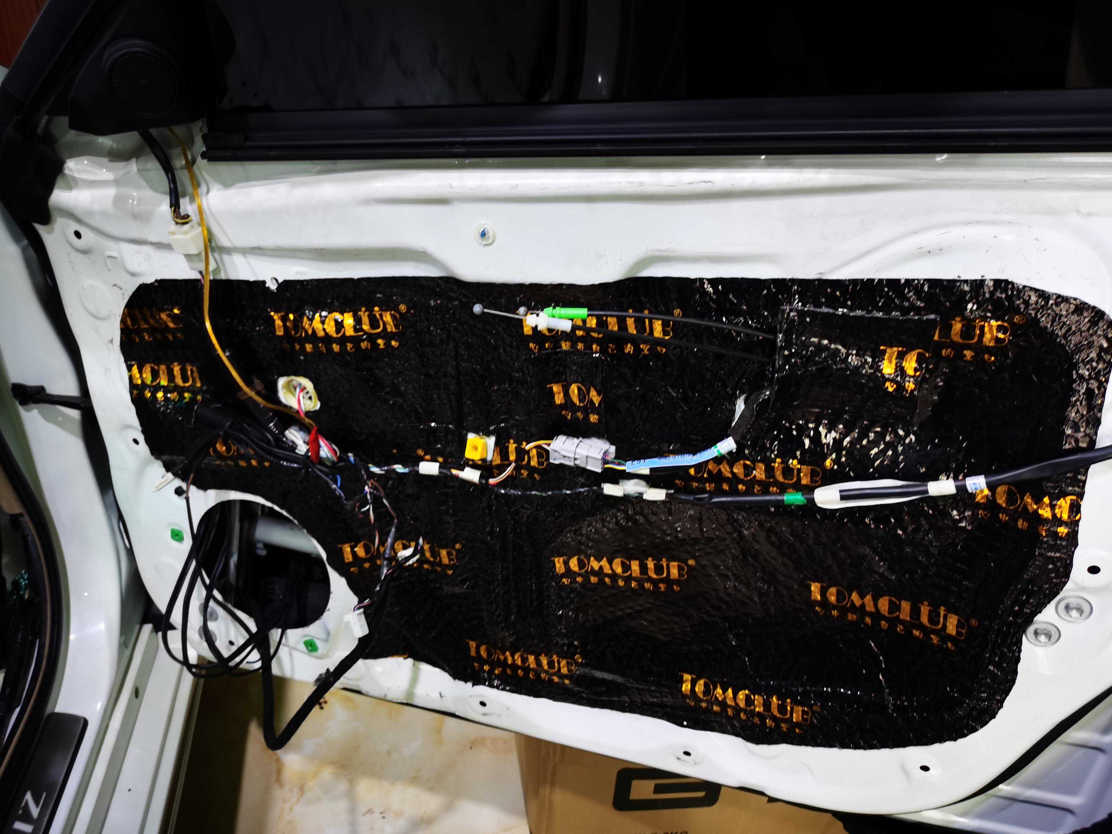 首先使用TOMCLUB堂口隔音材料对汽车门板做隔音处理,让门板形成一个密封的箱体,可以让喇叭更好的发挥,又可以抑制钣金较薄所产生的共振与风噪等问题。