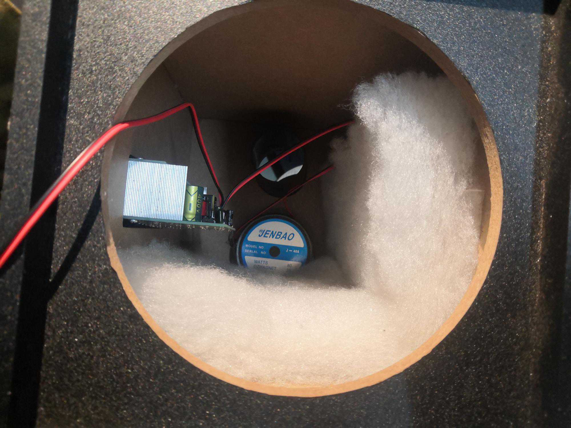 4、最后!将隔音棉平铺在音响内,然后把螺丝啥的都固定固定,这样一个音响就组装好啦。