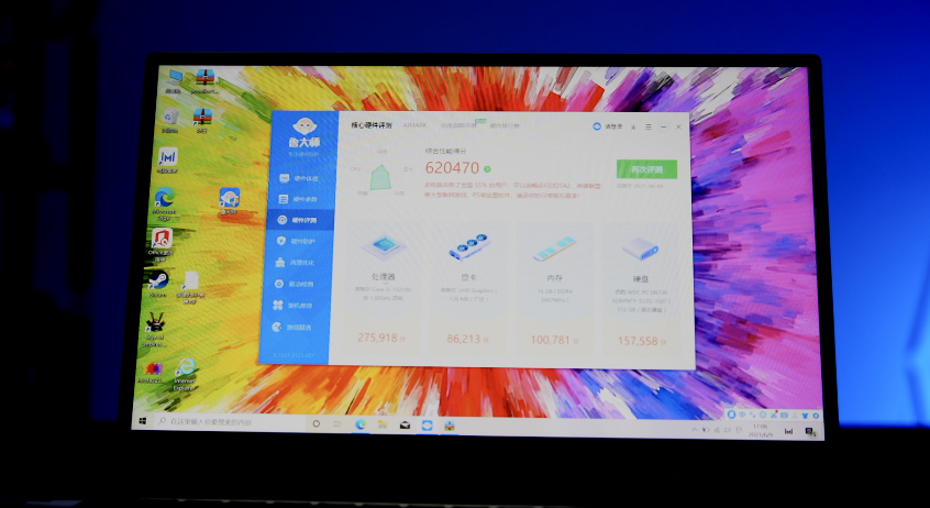 而在配置方面,MagicBookX14采用的英特尔第十代处理器i5-10210U,集成显卡,我用的这台是顶配16+512GB的存储组合。在这里我也是用娱乐大师跑了一下分,大家看看就好。结果显示可以胜任日常办公以及网游。可以说,除了性能以外,硬盘速度对于体验的影响也很大,我至今都忘不了被iMac垃圾融合硬盘支配的恐惧。