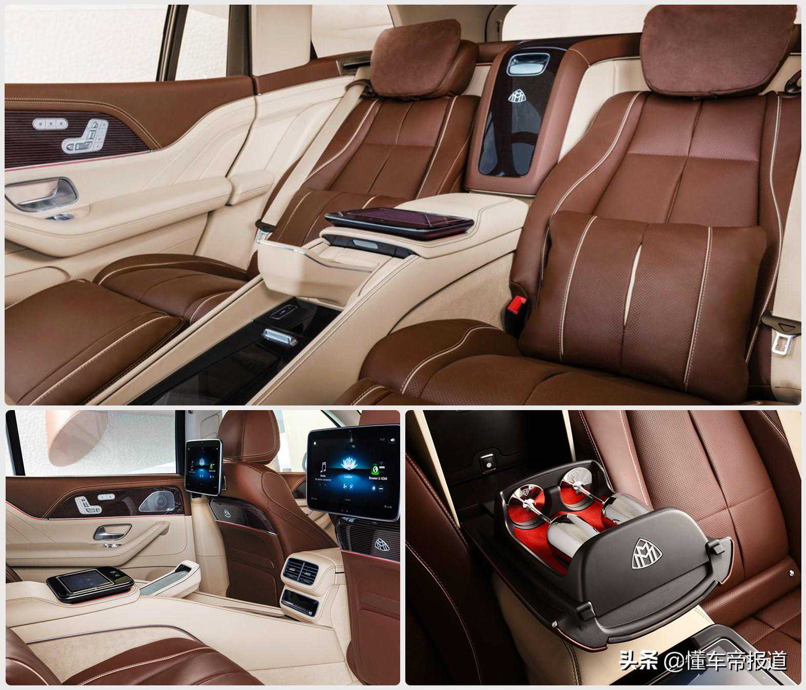 对于迈巴赫车型来说,后排自然是重点。梅赛德斯-迈巴赫GLS的后排双独立行政座椅,椅背倾斜角度最高可达43.5度,后排腿部空间最大可达1.34米,营造可实现深度放松的空间氛围。除了冷藏箱和折叠式小桌板,隐藏在中控台木饰盖板下的恒温杯托和储物箱可放置原装银色香槟高脚杯,标配的后排尊享套装包含一台可移动的7英寸安卓系统平板电脑,后排乘客不仅能借助它控制MBUX智能人机交互系统所有的舒适和娱乐功能,还可控制后排舒适组件和后排自动空调。