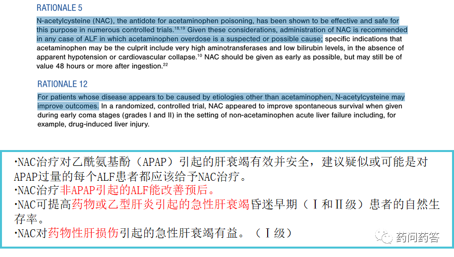 2、NAC治疗非APAP引起的ALF能改善预后。并且能够提高药物或乙型肝炎引起的急性肝衰竭昏迷早期(Ⅰ和Ⅱ级)患者的自然生存率。对药物性肝损伤引起的急性肝衰竭也是有益的。