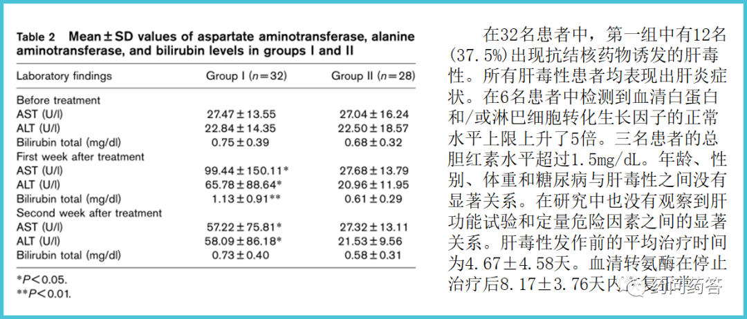 结果:治疗1周和2周后,第一组的AST和ALT明显高于第二组。第一组有12名患者(37.5%)出现肝毒性,第二组无一例。肝毒性发作前的平均治疗时间为4.67±4.58天。