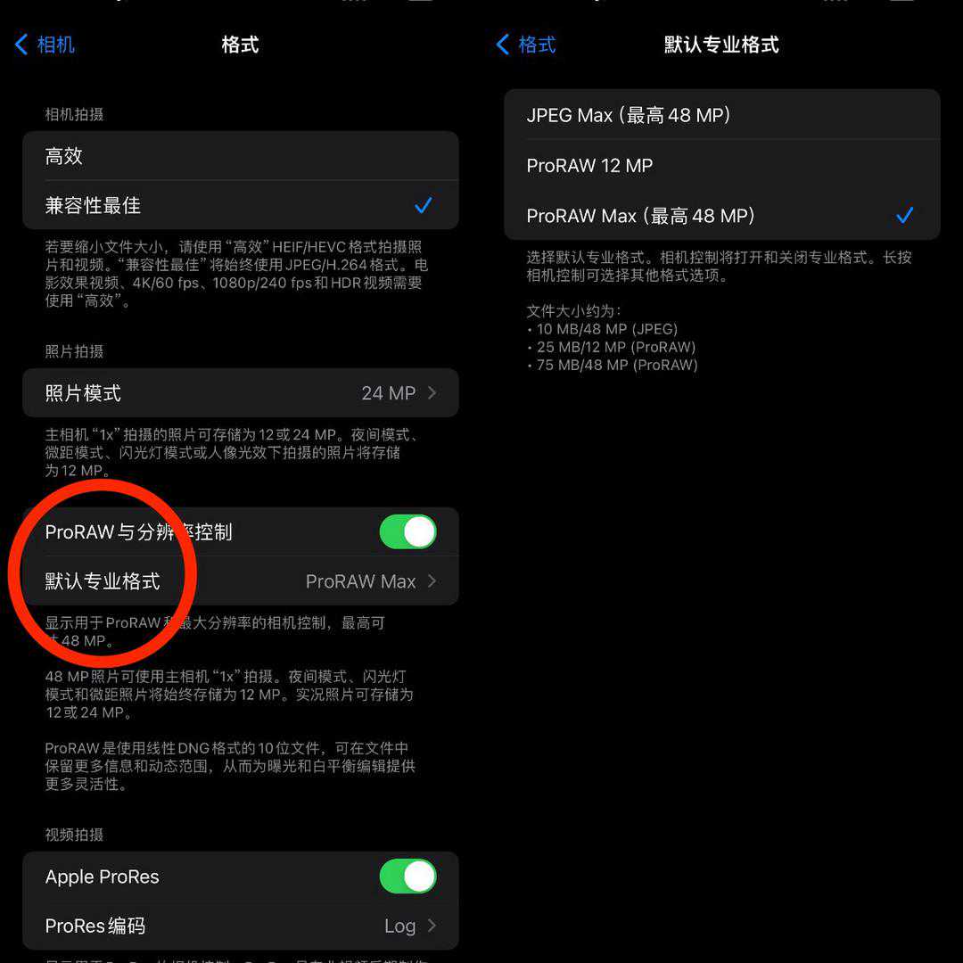 ProRAW格式:1200万像素、4800万像素