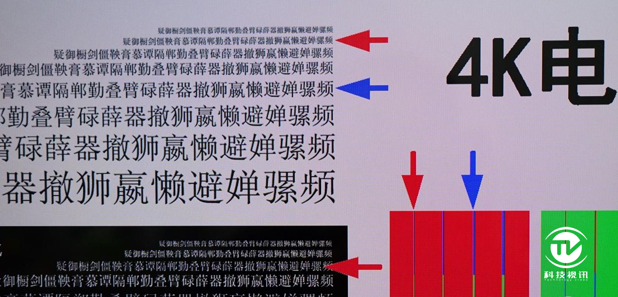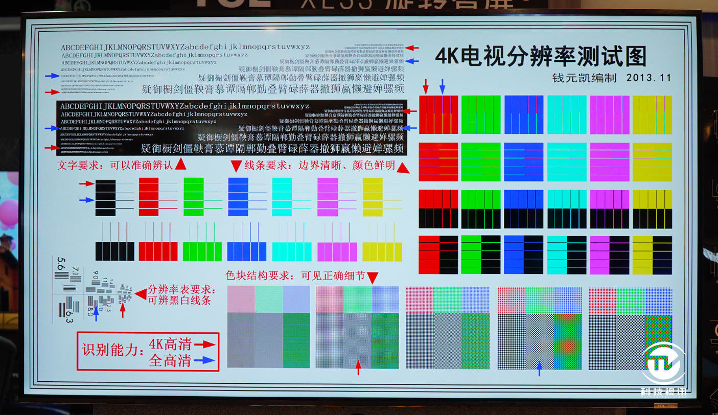 首先是4K分辨率测试,虽然说如今的绝大部分智能电视在名义上普遍都有4K的清晰度,但是根据面板和芯片技术的不同在分辨率方面还是有所差异。经过实测,可以看到代表4K合格水准的红色箭头所指向的细小字体都可能得到较为清晰的展示,表明TCL·XESS旋转智屏A200S的分辨率水准还是非常不错的。