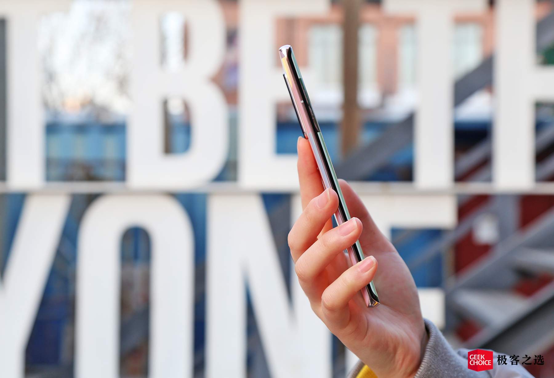 正面可能不太明显,但将视角转到侧面可以清楚看到,实际上它的屏幕两侧与中框连接处,设置有和上边框几乎等宽的黑边,同时由于屏幕边缘伴有一定倾角,握持手机时,手指并不容易直接接触到屏幕有效触控区域,所以大可不必担心会因为误触而影响到正常使用体验。