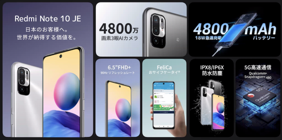 相比于国际版RedmiNote105G,RedmiNote10JE新增加了IP68防尘防水,支持日本移动钱包Felica标准NFC通信协议。