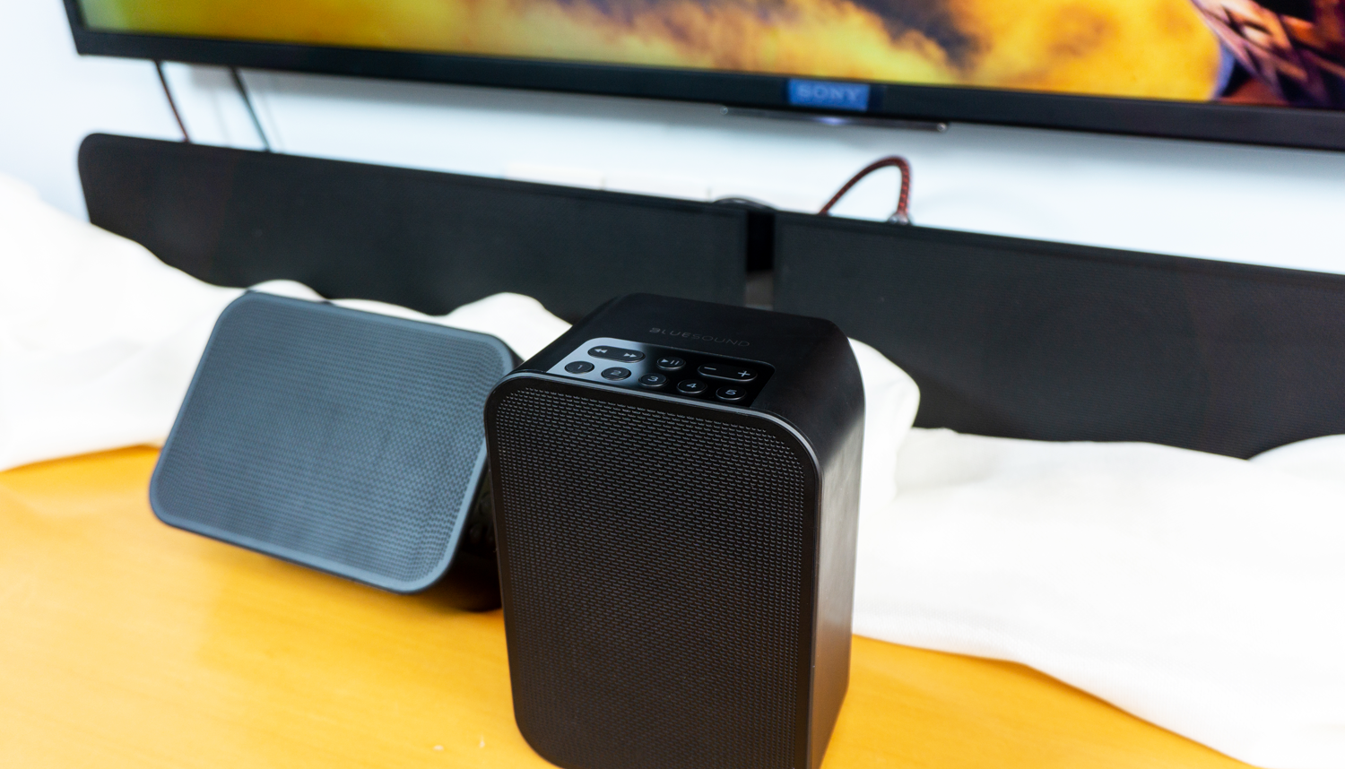 回音壁、对箱加低音炮组合我用的回音壁是BLUESOUND的PULSESOUNDBAR2i,这也是最早入手的BLUESOUND产品,后续的音箱与低音炮都是围绕着它来架构,称其为“地基”都不为过。