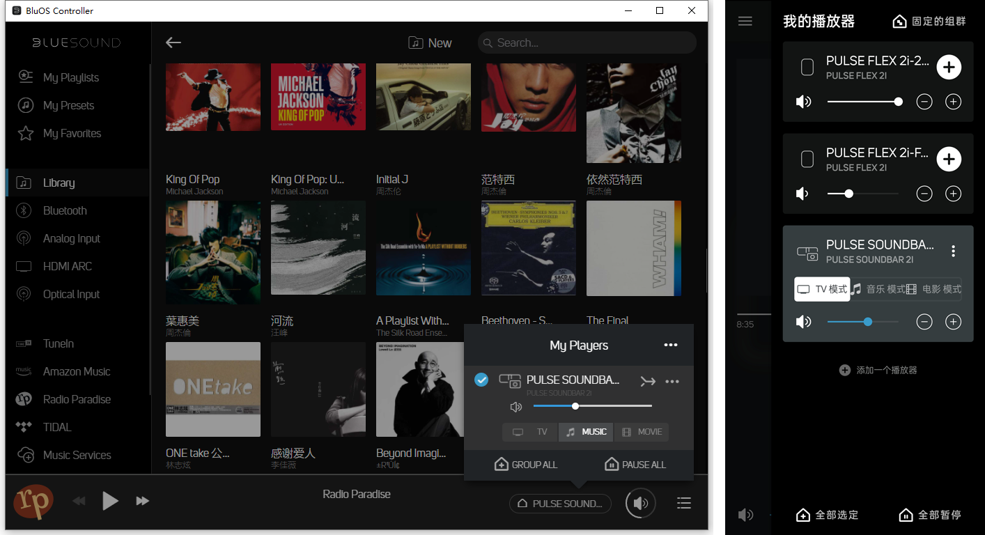 不过在使用“家庭影院的组群”时也出现了令我不满意的地方,如成组后就不能再单独指定PULSEFLEX2i播放音频,回音壁和PULSEFLEX2i只能作为一个固定的组来控制,不过幸好只需在BluOSAPP中调整一下就行了。