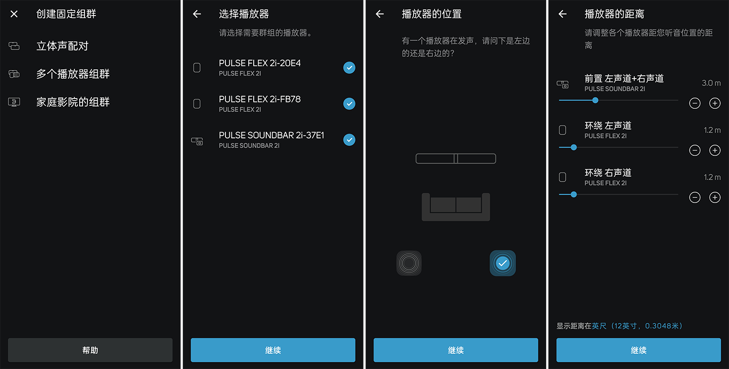 组建步骤相当简单,只需在BluOS内选择创建“家庭影院的组群”,将PULSESOUNDBAR2i和PULSEFLEX2i选中,然后设置左右声道和间距后即可完成。