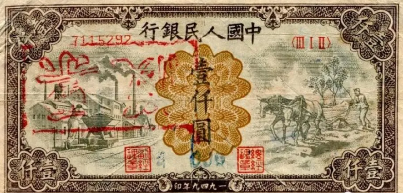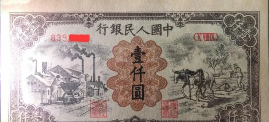 第一版人民币壹仟圆运煤与耕田正面
