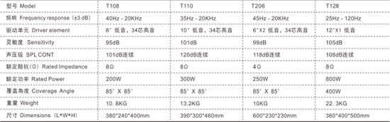 从参数方面来看,T108影K音箱,驱动单元是8寸低音、34芯高音,频响则为40Hz-20KHz,在8Ω阻抗的情况下灵敏度有95dB,说明T108并不难驱动,作为两声道或者K歌都应该能轻松搭配。而T110的结构设计与T108相似,驱动单元是10寸低音单元、34芯高音单元,频响为35Hz-20KHz,在8Ω阻抗的情况下灵敏度有101dB,参数上更优。