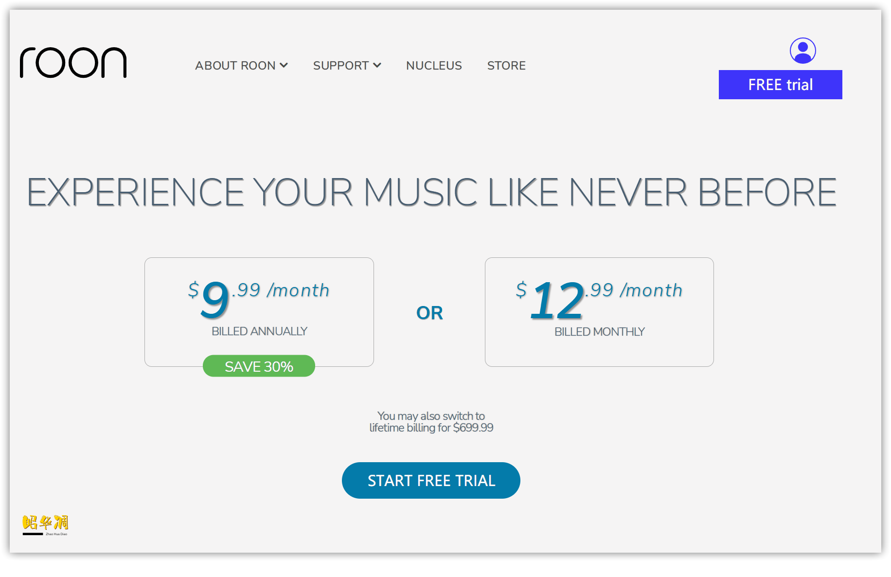 roon不是免费软件,包年价格118.8美刀(折合单月价格9.9)、单月付费价格为12.99美刀、一次性买断则是699.99美刀。我们可以先点右上方的试用链接体验14天。