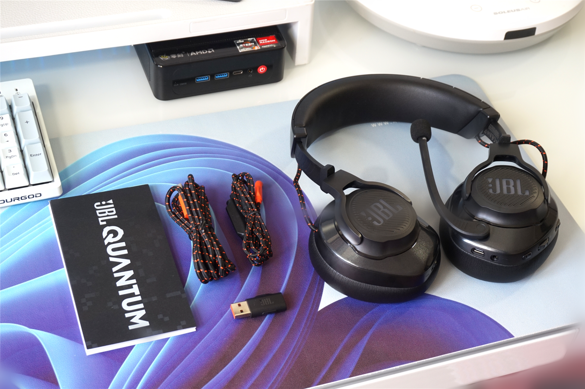 JBLQuantum610的配件非常丰富,除了耳机之外,还有USB充电线、3.5mm音频线、2.4GUSB无线适配器、麦克风防风罩等。