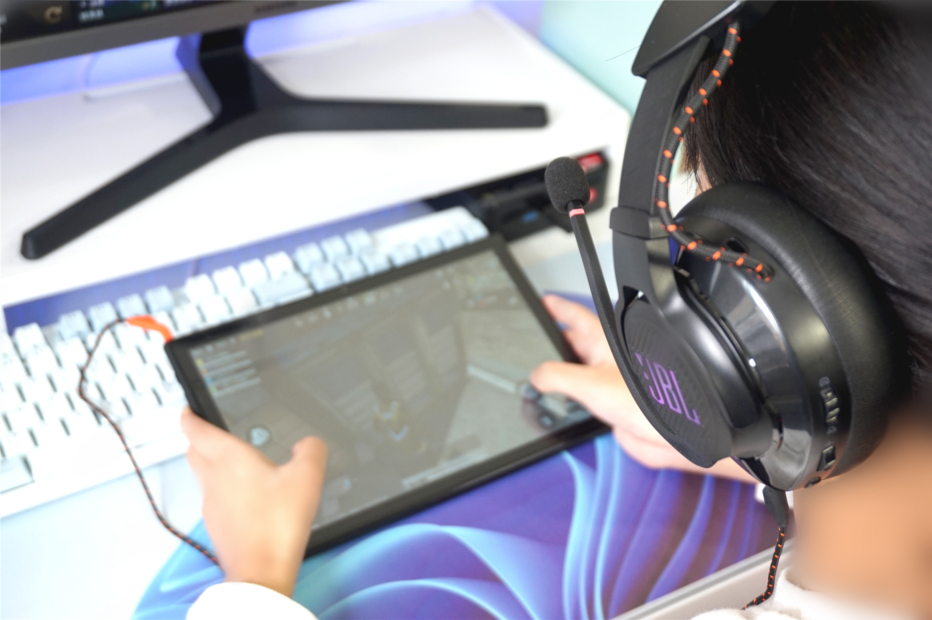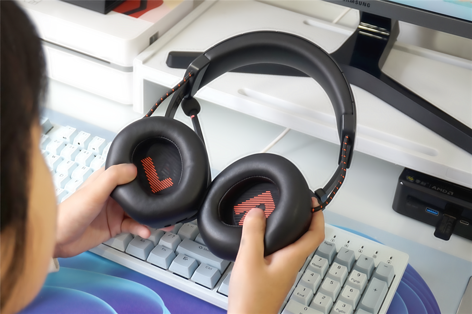 大家还有必要了解的是,JBLQuantum610上的“JBL”logo还带有RGB灯效。尤其在晚上玩游戏时,酷炫的光效大大提升电竞感,游戏氛围更强。