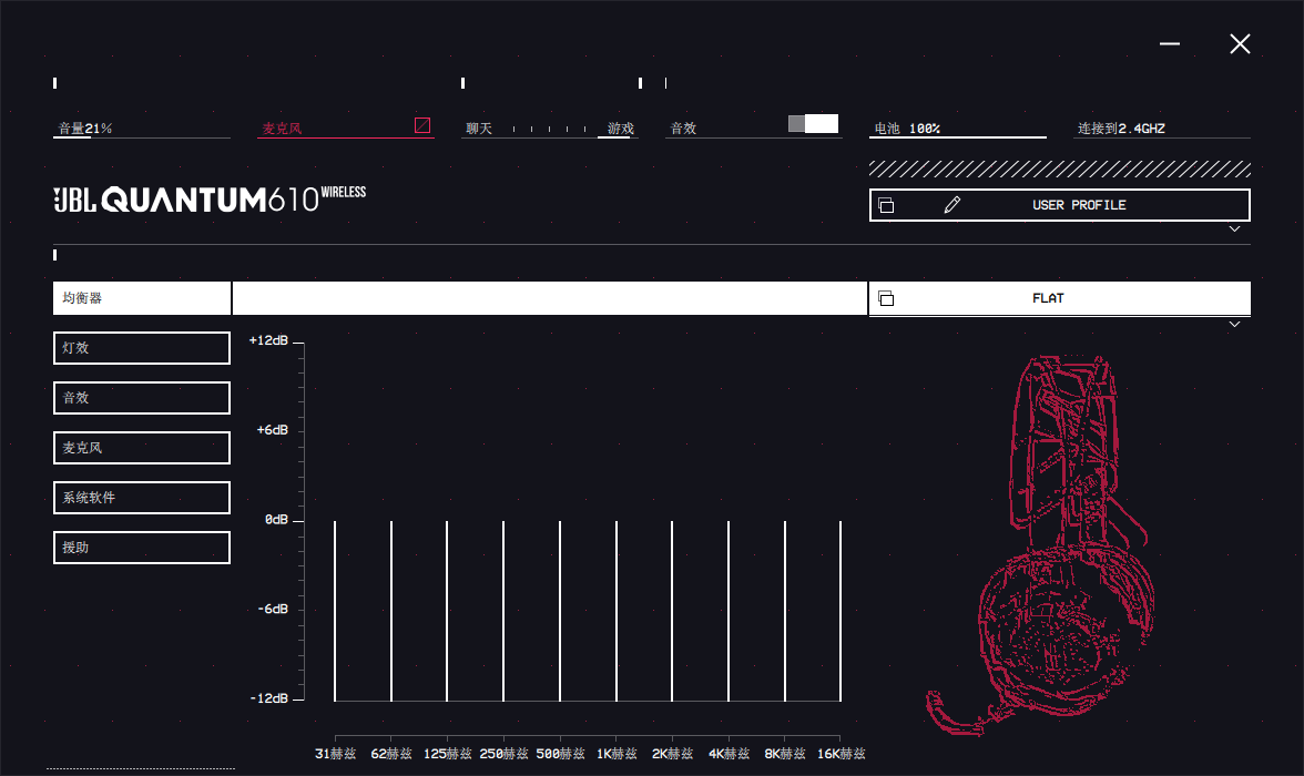 打开JBLQuantumENGINE的客户端可见,它所显示的内容非常全面,支持音效、灯效、麦克风等多项功能的调整。使用时可根据个人使用习惯、需求,将耳机的各项参数调整至最适合自己的状态。