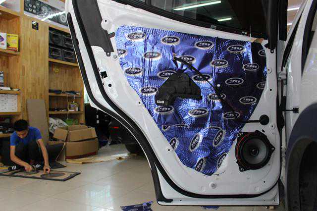 接着对门板进行隔音施工,车门隔音使用大能蓝金刚进行内外层隔音,能够增加钣金厚度增强车门钣金刚性,降低行驶时因金属薄弱产生的共振,以及长期坎坷路面行驶下因金属疲倦产生的杂音,更好的止震降噪,同时形成密封箱体,更好的展示音响的音色音质!