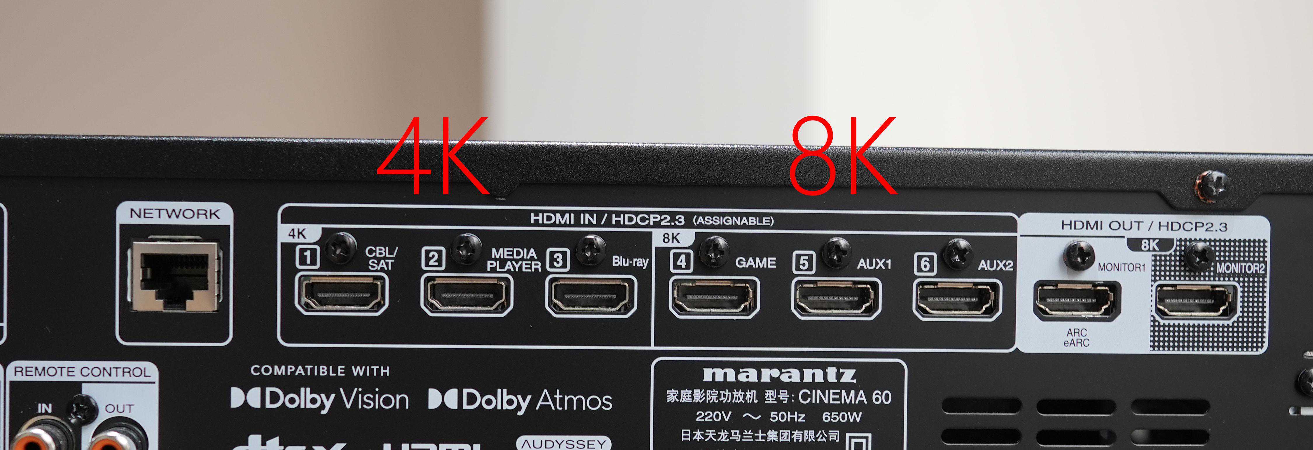 单独上图,让大家看得更清楚一些!50比60要多三个8KHDMI输出,因为更大的发热量,所以HDMI输入部分多了一个黑色的散热器。