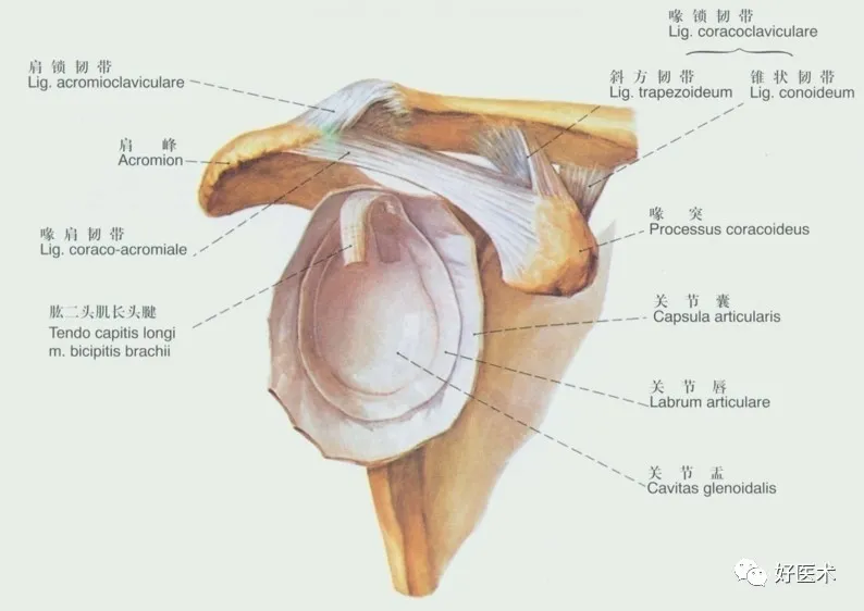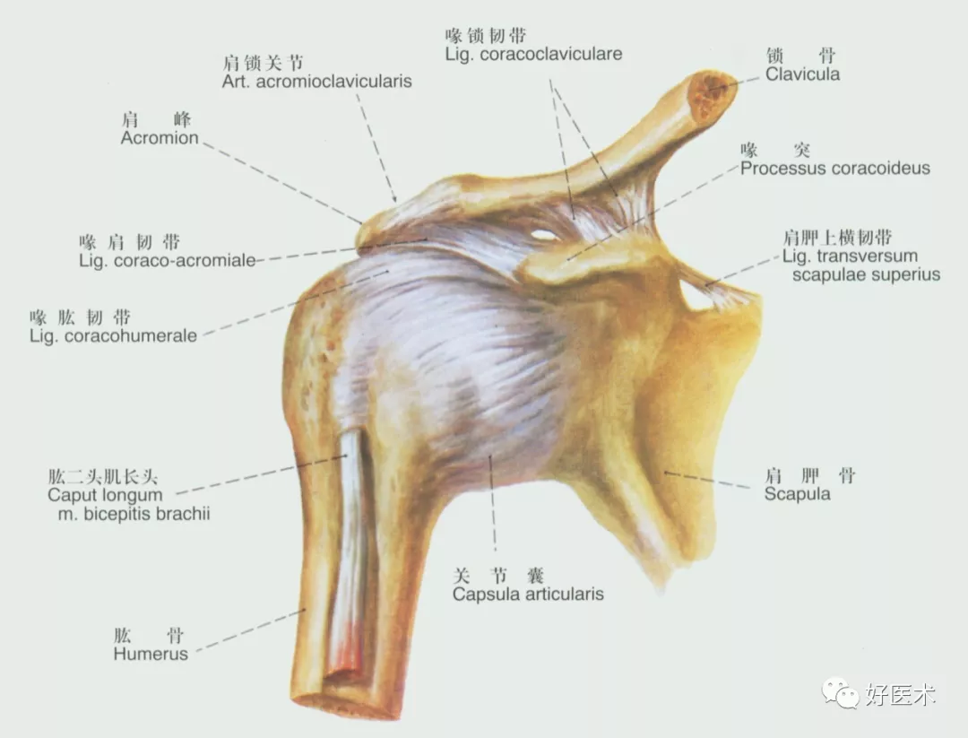 (9)喙肩韧带:呈三角形,连结喙突外侧缘与肩峰尖部的前缘之间。其前后部较厚,而中间部很薄,呈薄膜状,此韧带构成所谓的“喙肩弓”,可防止肱骨头向内上方脱位。