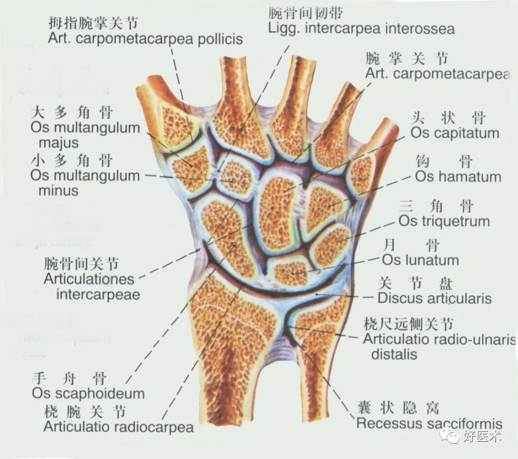 (3)腕骨间骨间韧带:有两条,分别介于舟骨与月骨及月骨与三角骨之间,并与骨间掌侧和背侧韧带相愈合。此韧带与舟骨、月骨及三角骨共同构成桡腕关节的关节头。
