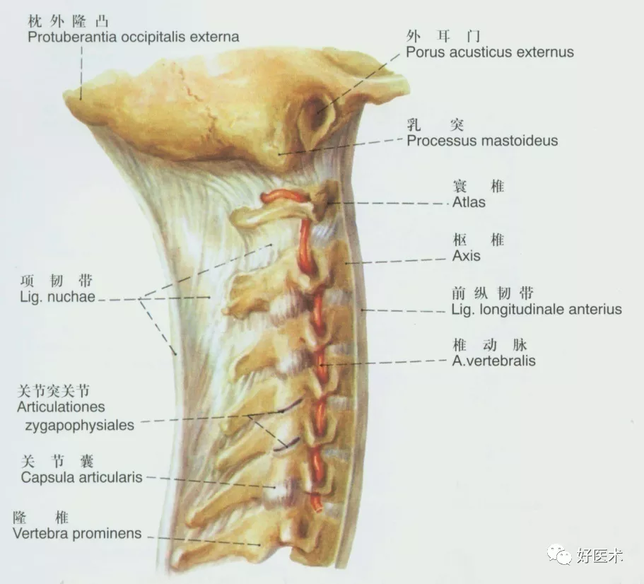(9)寰枕外侧韧带:连结寰椎横突的上面与枕骨的颈静脉突之间,有加强关节囊外侧壁的作用。